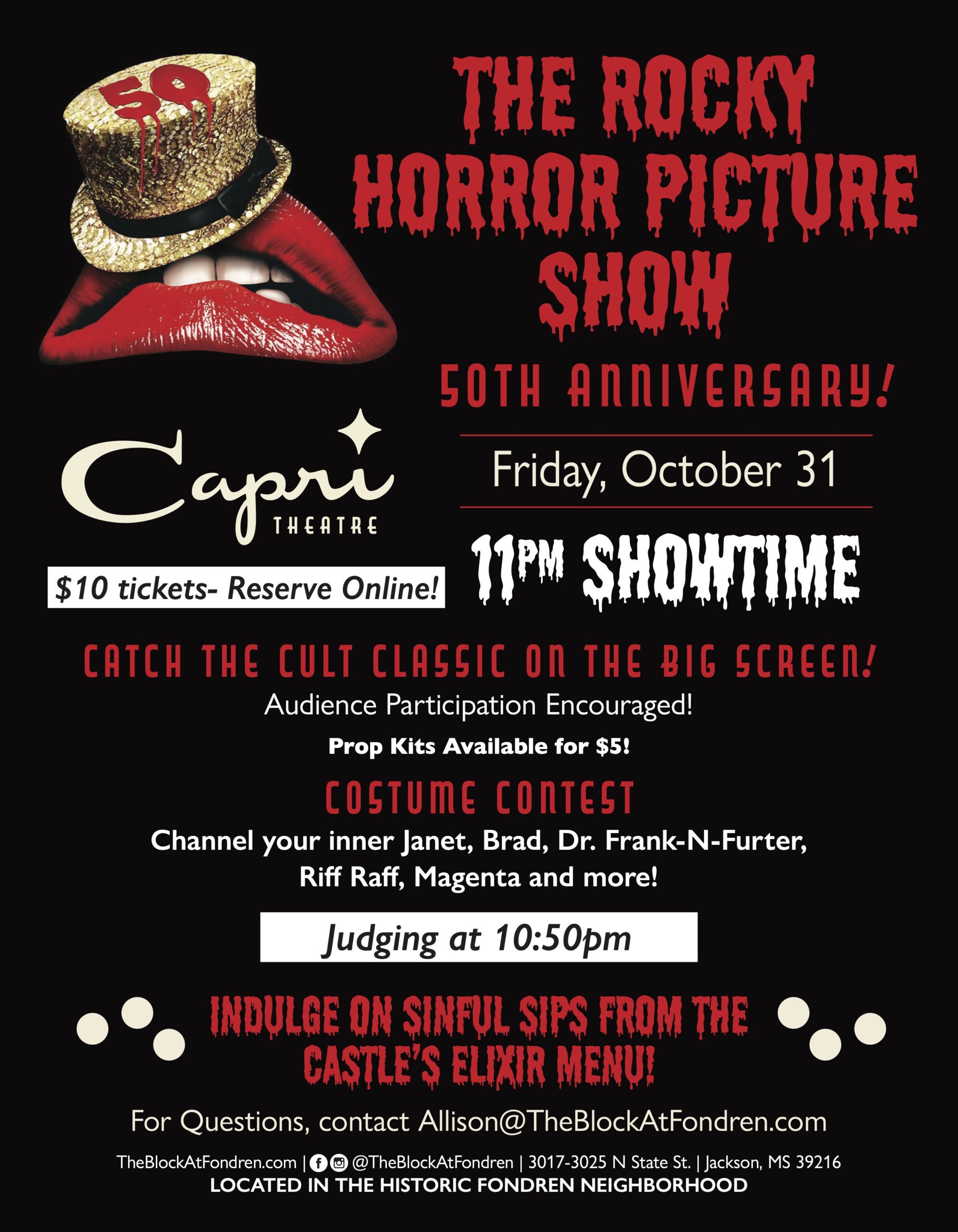 Let’s do the Time Warp again! Join us Friday, October 31 at 11 PM at The Capri for The Rocky Horror Picture Show! Costumes encouraged and grab a $5 prop kit at the show. Don’t miss the fun — get your tickets online today!